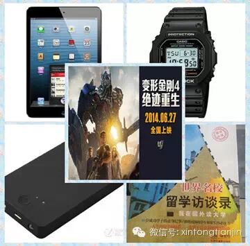 。新通教育天分公司在活动现场将提供IPAD mini 1台,知名品牌手表 2块,名品移动充电宝 10台,《变形金刚》3D观影票30张 和《世界名校访谈录》300本。